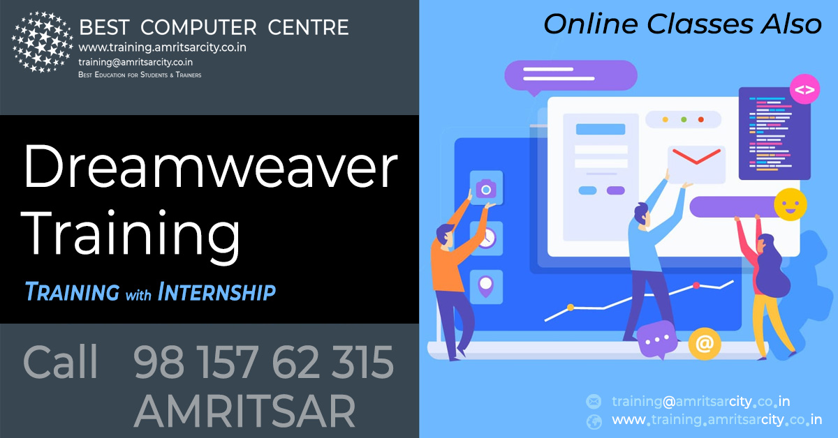 Adobe Dreamweaver is the most mainstream web writing stage available, without exception. Whether your objective is an imaginative standalone page, a whole website, or an adaptable web application, you won't locate a superior device for building and altering your web-based task continuously. What's more, in these focused on Dreamweaver Training in Amritsar, you'll learn key design aptitudes and application controls that will offer you some assistance with taking your venture from beginning to finish. Best Adobe Dreamweaver Course Training Institute In Amritsar and learn Online Dreamweaver Course from Best Computer Centre.